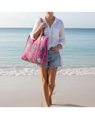 Un sac de plage qui change tout ! Fuchsia profond, toile recyclée, cuir véritable : un combo stylé et solide pour embarquer serviettes, goûters et...
