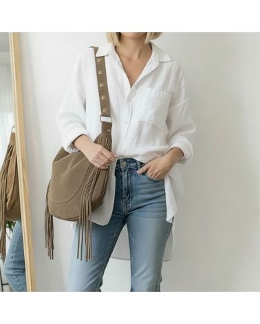 Le sac à franges Arizona est le genre de sac qu’on attrape sans réfléchir, parce qu’il va avec tout, qu’il a du style, et qu’il en jette sans en faire trop. Avec sa coupe souple, ses grandes franges qui dansent et sa belle couleur taupe, il donne direct du caractère à vos looks du quotidien.
