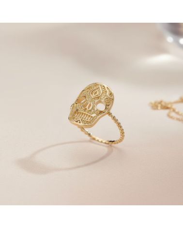 Un bijou au caractère affirmé inspiré des traditions mexicaines. Cette bague en plaqué or 750 - 5 microns arbore une tête de mort Calavera, emblème iconique du Día de los Muertos, symbole de force et de célébration de la vie.