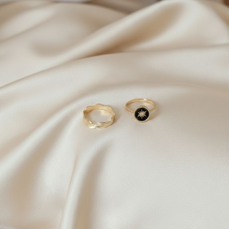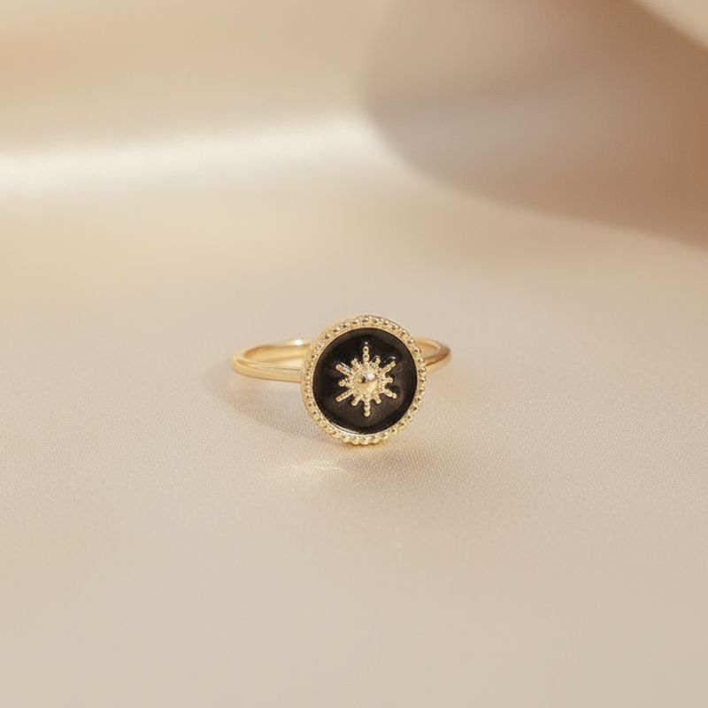 Un anneau fin en plaqué or 18 carats – 3 microns, rehaussé de détails perlés sur un émail noir profond. Son étoile centrale apporte une touche d’éclat et de raffinement, parfait pour sublimer votre main avec style.