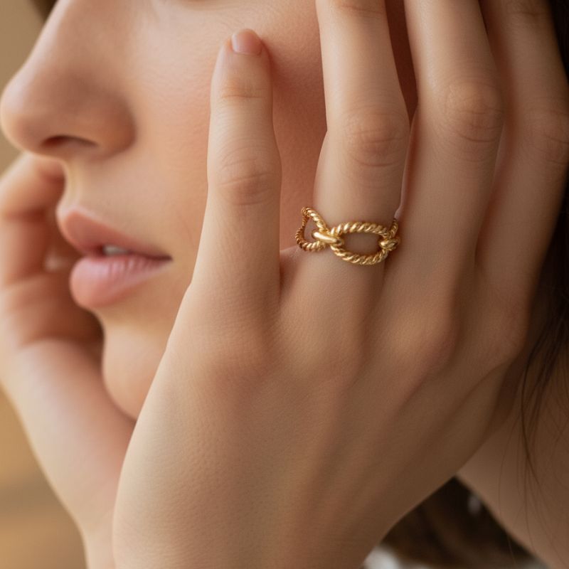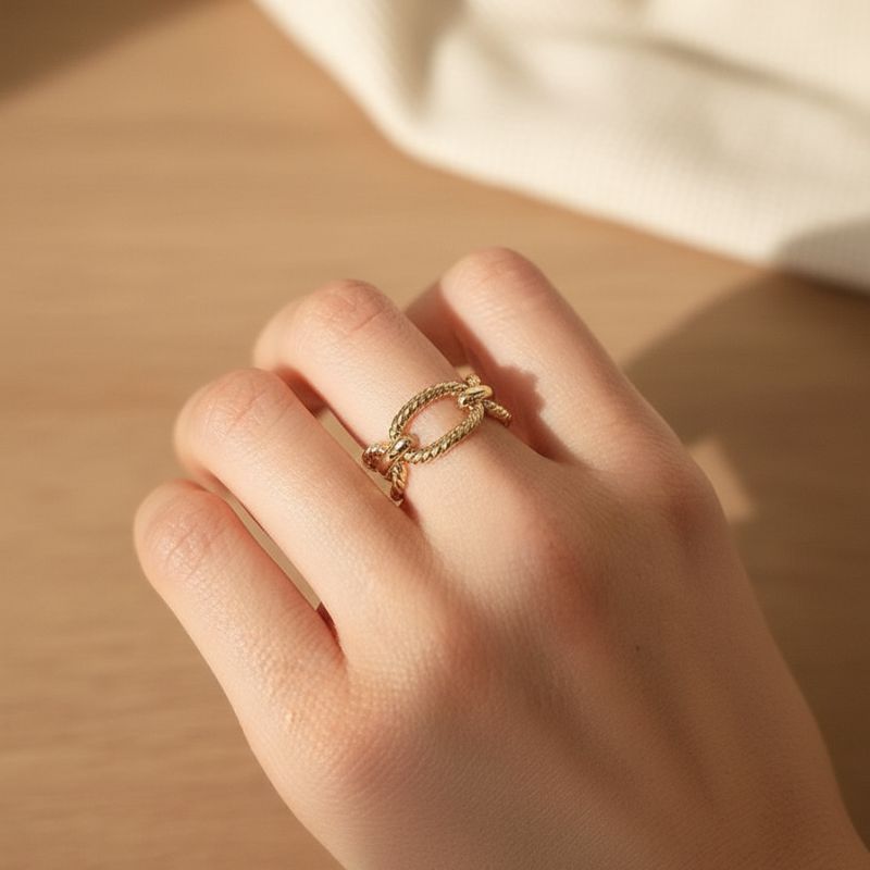 Un bijou au design travaillé qui allie élégance et caractère. Cette bague en plaqué or 18 carats séduit par son anneau au maillage large et tressé, apportant une touche sophistiquée et intemporelle à votre style.