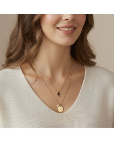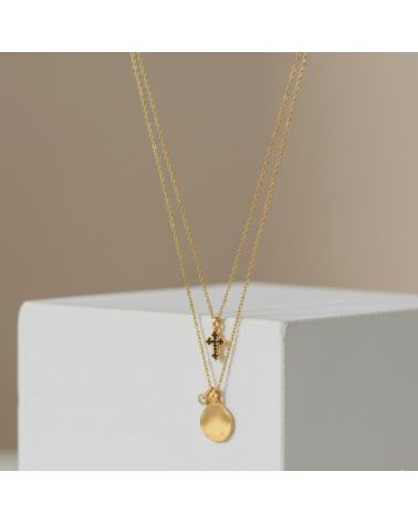On craque pour ce double rang plaqué or 18 carats qui mixe les styles. Une petite croix réhaussée de Zirconium noir pour un contraste parfait et juste en dessous, un médaillon sublimé par un Zirconium blanc étincelant. Le bijou idéal pour un style naturellement sophistiqué.