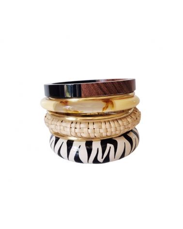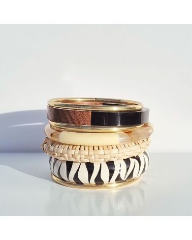 Bois, résine et métal doré dans une palette de teintes naturelles prêtes à compléter chaque look avec une simplicité sophistiquée.