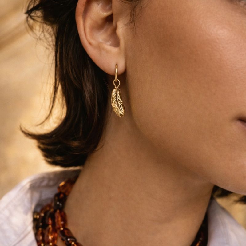 Ces mini-créoles en acier inoxydable doré signées Mile Mila se parent d’un pendentif plume délicat.