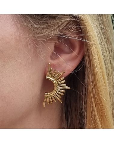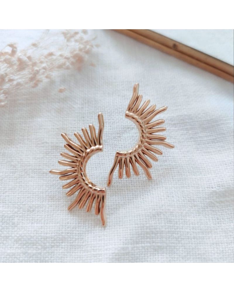 Un design original, tout en finesse : ces boucles signées Mile Mila reprennent une forme demi-lune ornée de rayons dorés pour un rendu à la fois moderne et lumineux. Leur structure ajourée capte joliment la lumière.