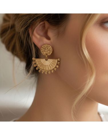Ces boucles d’oreilles Mile Mila apportent une touche graphique et élégante à votre look. La forme éventail associée au médaillon légèrement martelé crée un joli duo moderne, facile à porter au quotidien comme en soirée.
