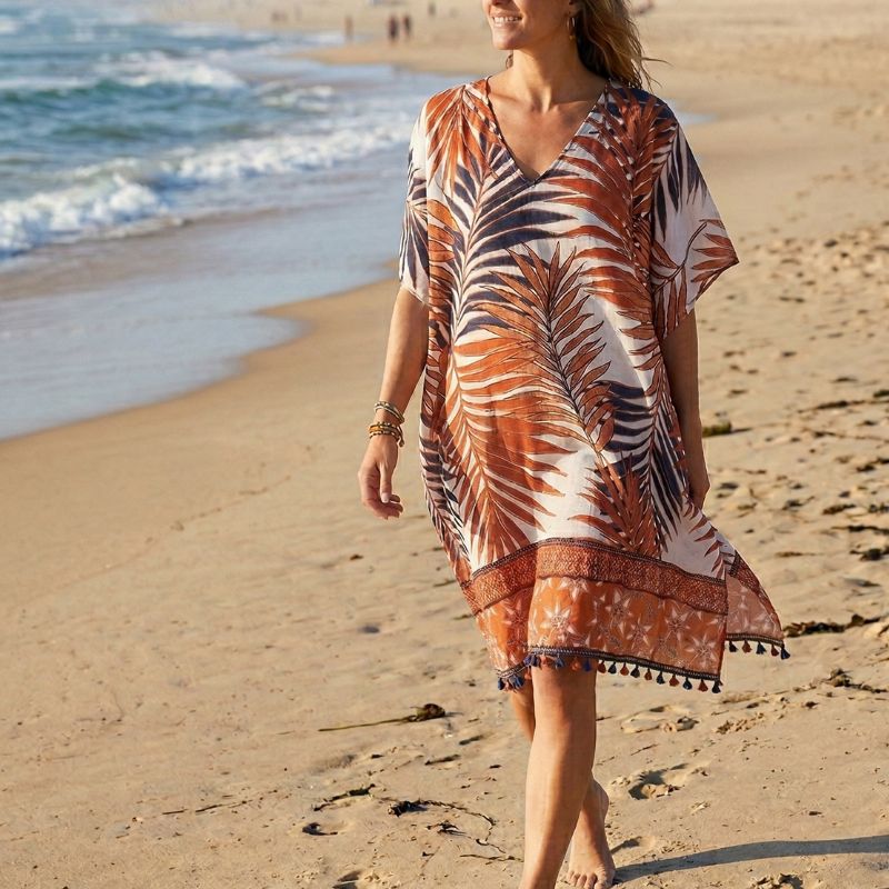100 % coton, léger et agréable à porter, il s’enfile facilement sur un maillot de bain pour filer vers la plage, la piscine ou la terrasse. On aime son imprimé palmier aux accents ethniques chic et ses teintes terracotta chaleureuses qui apportent tout de suite une allure estivale. Sa coupe ample et sa taille unique en font un caftan de plage facile à porter tout l’été.