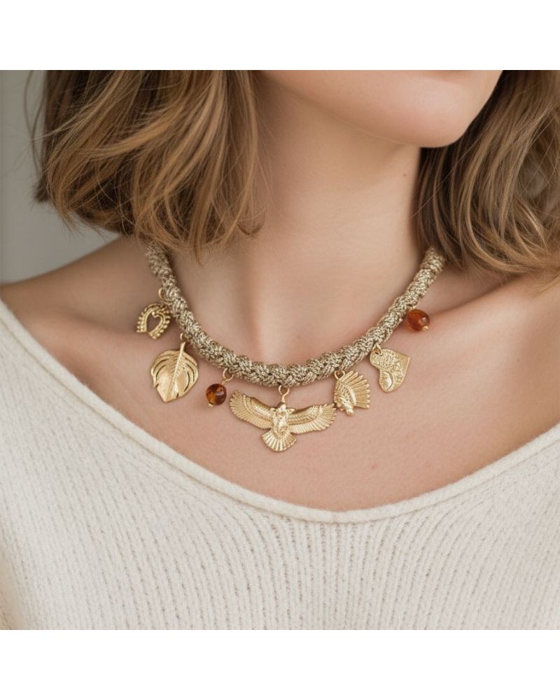 Collier doré au charme western chic, porté par un aigle iconique entouré de petits charms qui captent la lumière.