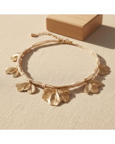Collier ras de cou doré mêlant cordon tressé et fine chaîne, avec de jolies breloques feuilles au fini texturé. Une pièce lumineuse, féminine et facile à porter, qui apporte une touche chic et naturelle à vos looks.