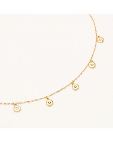 Le collier Dima offre une élégance minimaliste et contemporaine. Conçu en acier inoxydable, il est orné de 5 pampilles rondes. Chaque pièce est délicatement sertie d'une étoile gravée par un scintillant oxyde de zirconium.