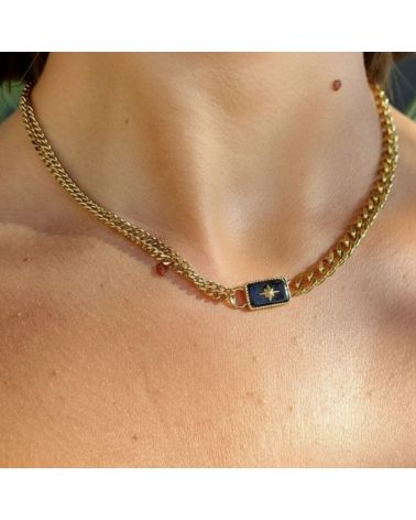 Ce collier en acier inoxydable est composé d'un maillage de chaine asymétrique fini par un pendentif rectangle orné d'une pierre naturelle ONYX