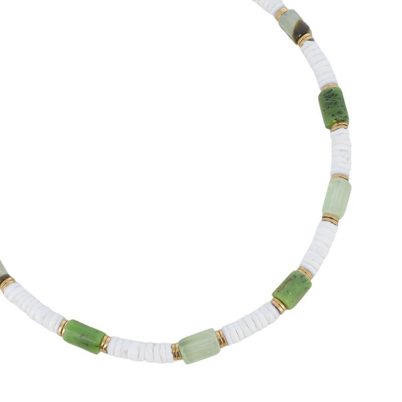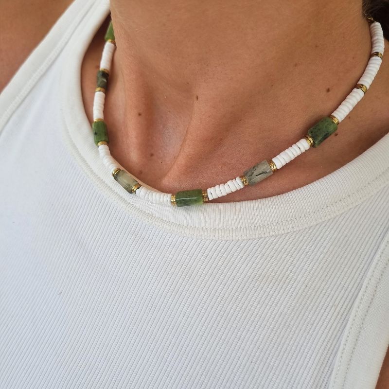 Collier de perles Heishi (perles de coquillages) orné de pierres naturelles d’agate verte