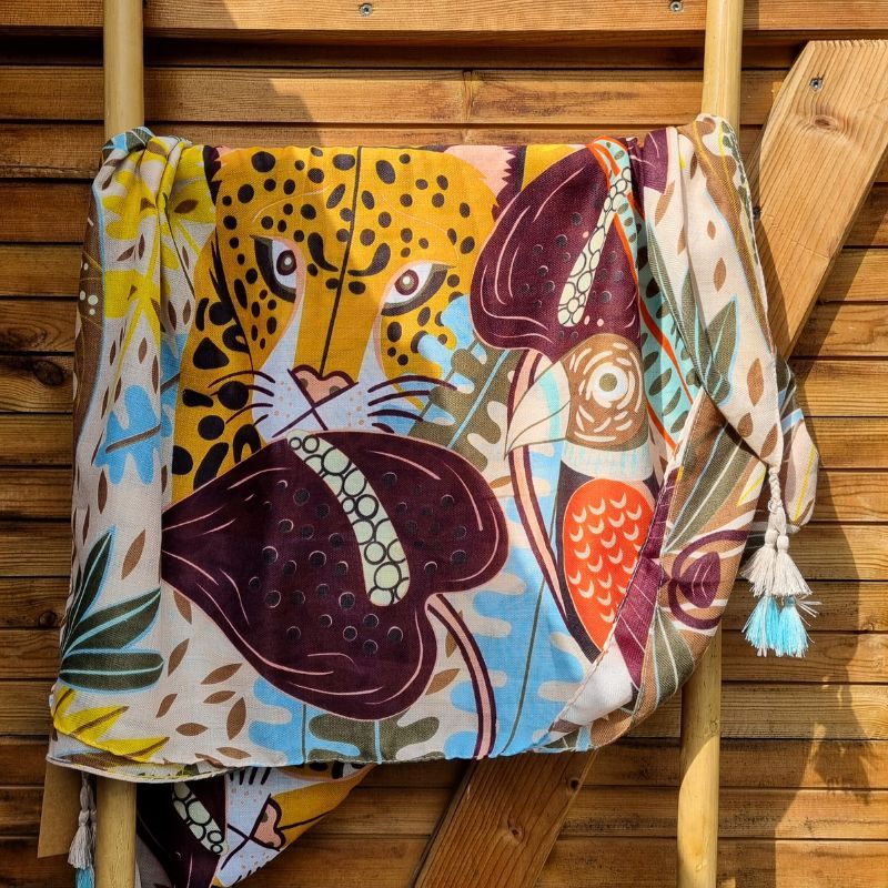 Conçu de motifs de panthère et de toucan sur un fond tropical, aux finitions soignées de pompons aux angles, il combine douceur et style, idéal pour rehausser une tenue avec une touche d’exotisme et de sophistication.