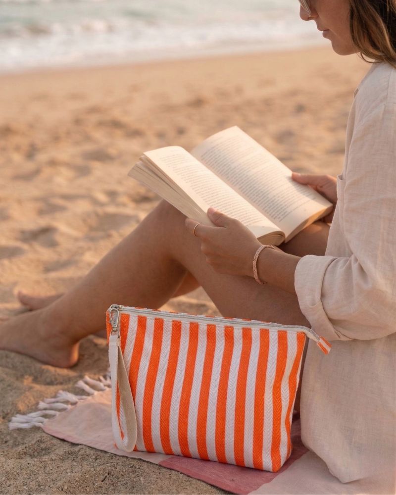 La pochette Guetary version Orange débarque pour booster votre été. Avec ses rayures ultra-canons, c’est la complice idéale pour garder vos essentiels à l’abri et bien organisés, du sable jusqu’à la paillote.