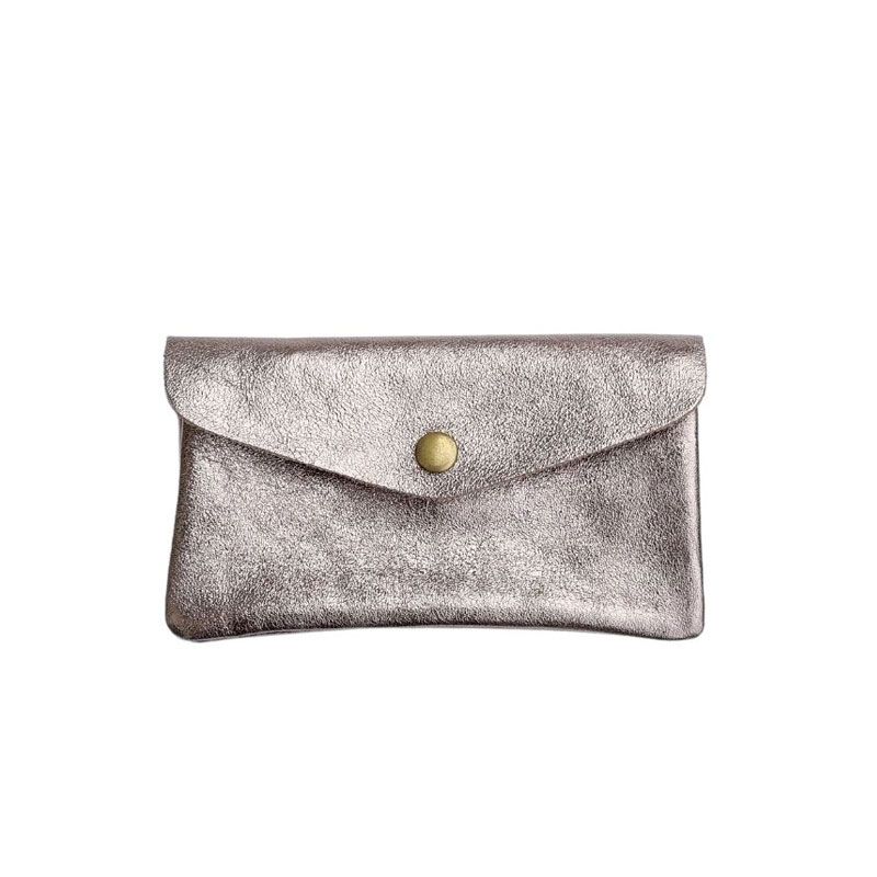 Porte Monnaie / Portefeuille Cuir métallisé Taupe Fermeture pression aimantée 2 soufflets – 3 compartiments dont 1 zippé Dimension : L15.5 x H 9 – Profondeur 1,5 cm Composition Cuir Couleurs Taupe Styles Casual Chic