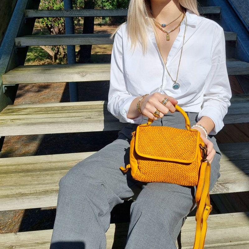 Mini BAG IT HIPPIE, cuir tressé Vintage, fabrication italienne Rabat avec fermeture par pression aimantée Cuir patiné & tressé pour un effet vintage Fermeture eclair dessus Intérieur doublé synthétique avec poche côté Bandoulière réglable. Dimension : 20 x 18 cm / profondeur 7 cm Collections Collection été, Sacs IT HIPPIE Composition Cuir Vintage Couleurs Moutarde Styles Casual Chic Cabas, sacs à main, tote-bags et accessoires en cuir ou croûte de cuir, aux influences Boho pour un style décontracté chic.