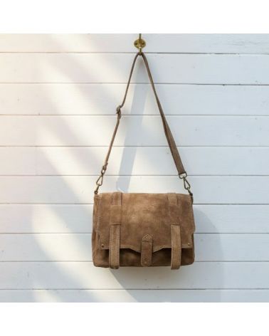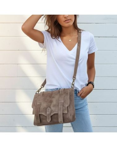 Le sac messenger en nubuck taupe est l’allié parfait pour un style casual avec une pointe de sophistication.